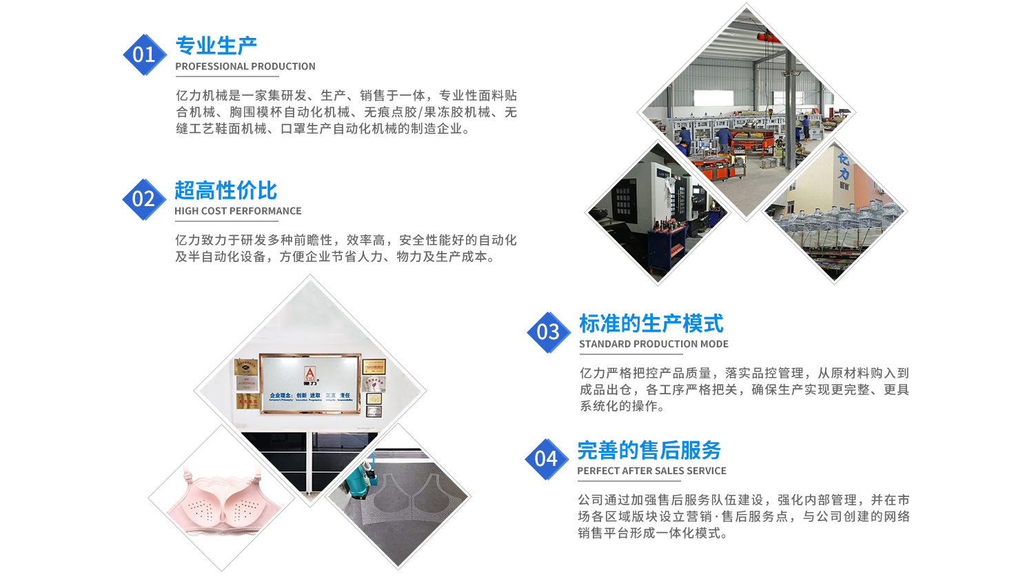 •   汕頭市億力機械設備有限公司是一家集研發、生產銷售于一體的專業性面料貼合機械、胸圍模杯機械、無縫工藝鞋面機械、口罩生產線和焊耳帶機械企業。